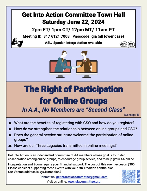 colaboración entre los grupos en línea, fomentar el servicio de grupo y ayudar a que AA crezca en línea. Todos los eventos de GIA están financiados por sus contribuciones.
