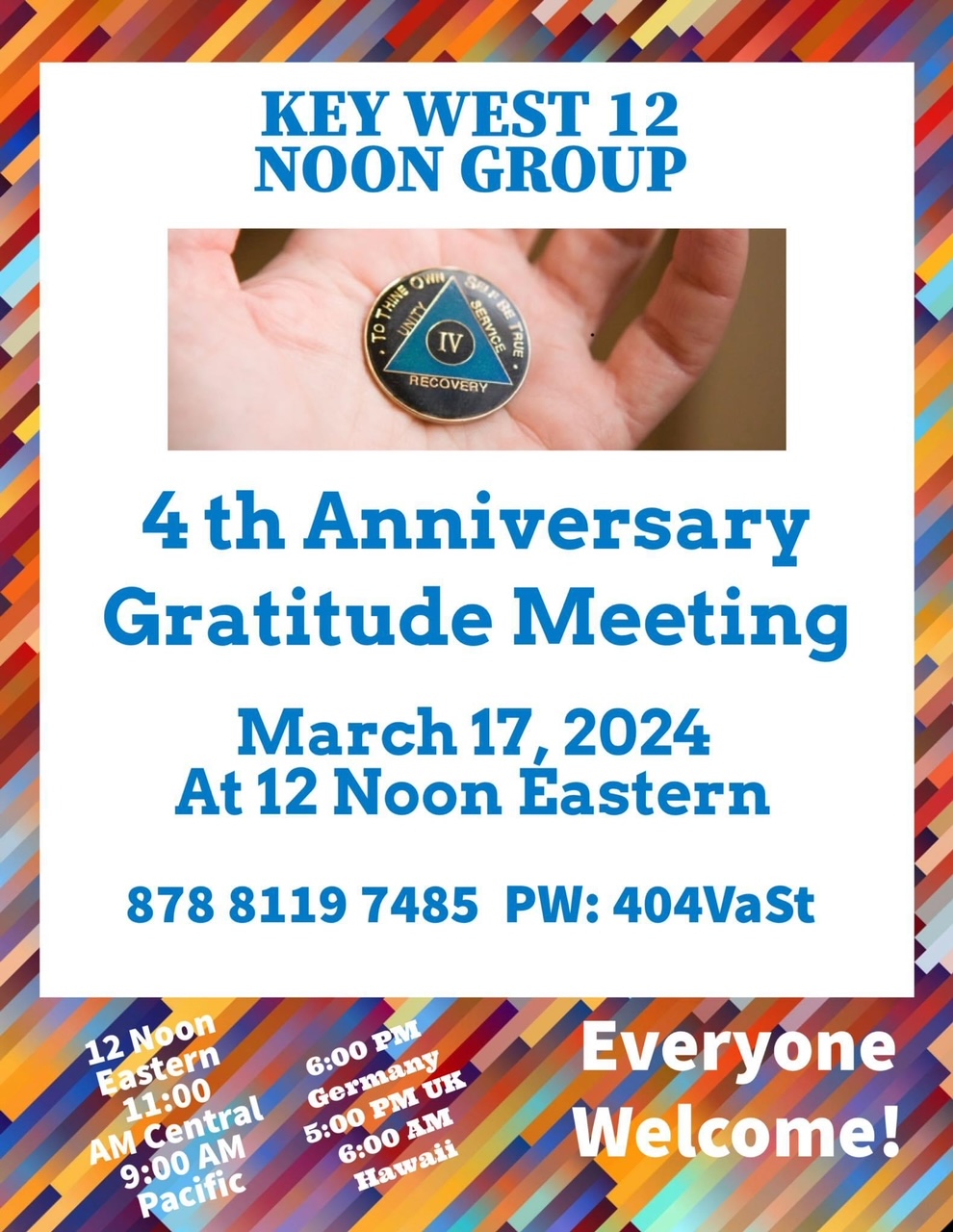 ¡Únase a nosotros para la Reunión de Gratitud del 4.º Aniversario del Grupo de las 12 del Mediodía de Key West de Alcohólicos Anónimos!