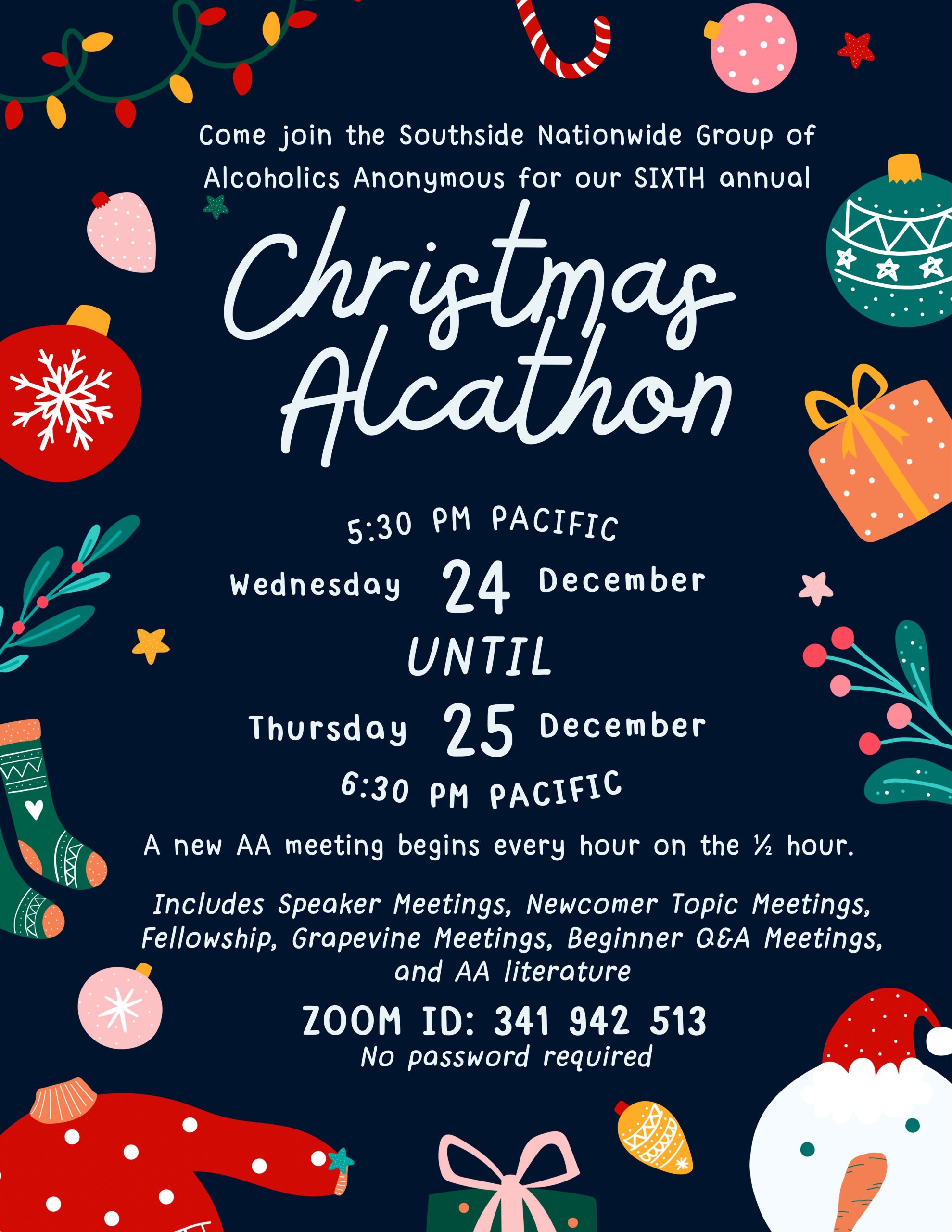 Notre 6e alcathon de Noël annuel ! De la joie de Noël, sans alcool ! 25 heures continues de réunions, chaque heure à la demi-heure. Il y aura des réunions de conférenciers, des réunions de nouveaux venus, des réunions thématiques et des réunions sur les étapes. Si vous avez besoin d’un peu de joie à 2 heures du matin, passez nous voir !