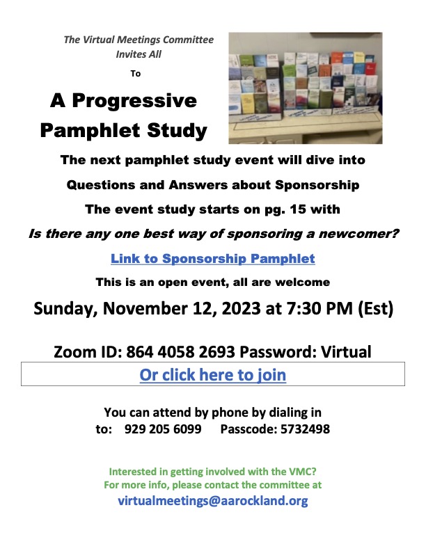 Cet événement est une étude de brochure sur le parrainage chez les Alcooliques Anonymes. Nous lirons et discuterons de la brochure AA Questions et réponses sur le parrainage. Cette étude commencera à la page 15 de la brochure avec “Y a-t-il une meilleure façon de parrainer un nouveau ?” Cet événement est ouvert et tous sont les bienvenus !