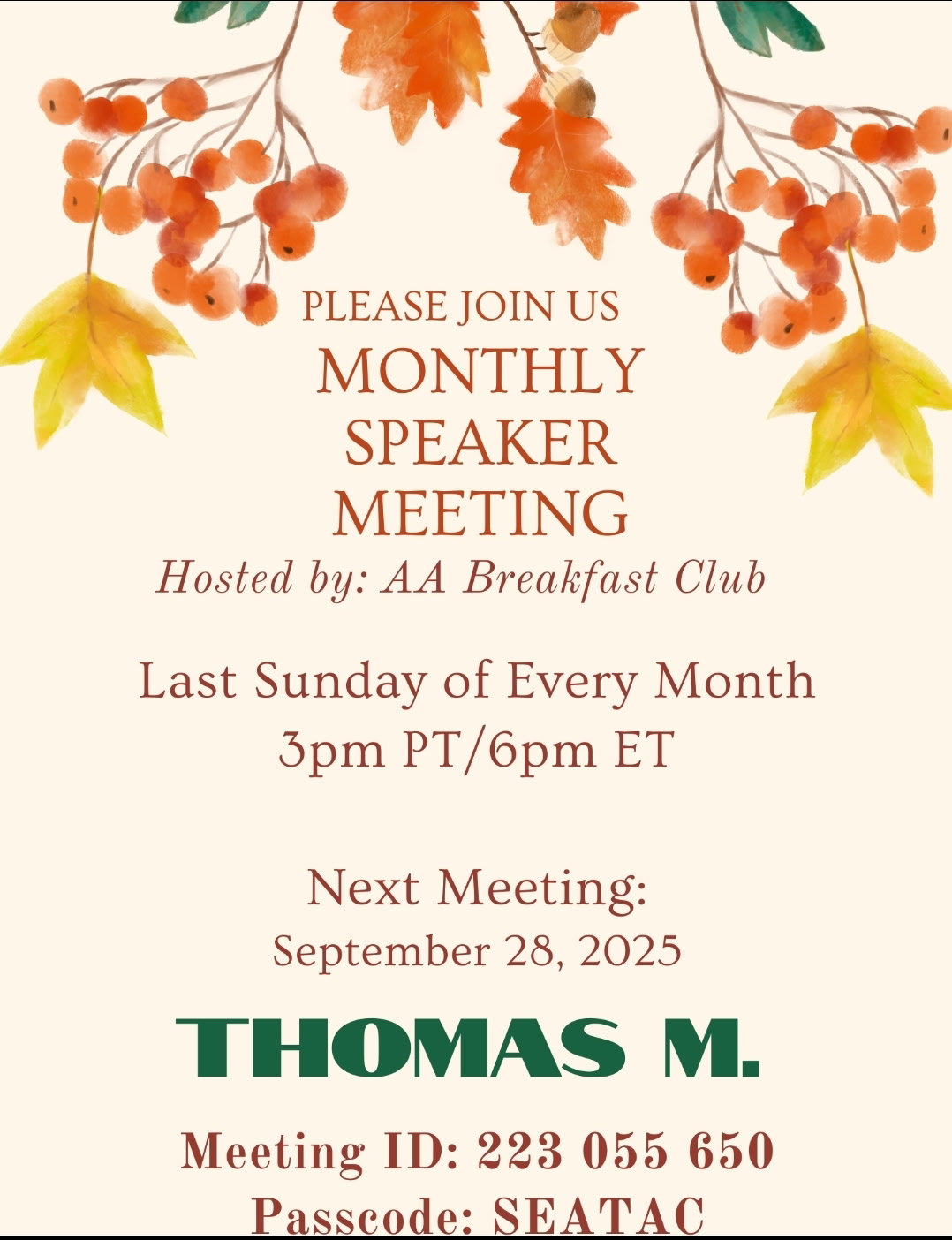 AA Breakfast Club invites you to our monthly speaker meeting.