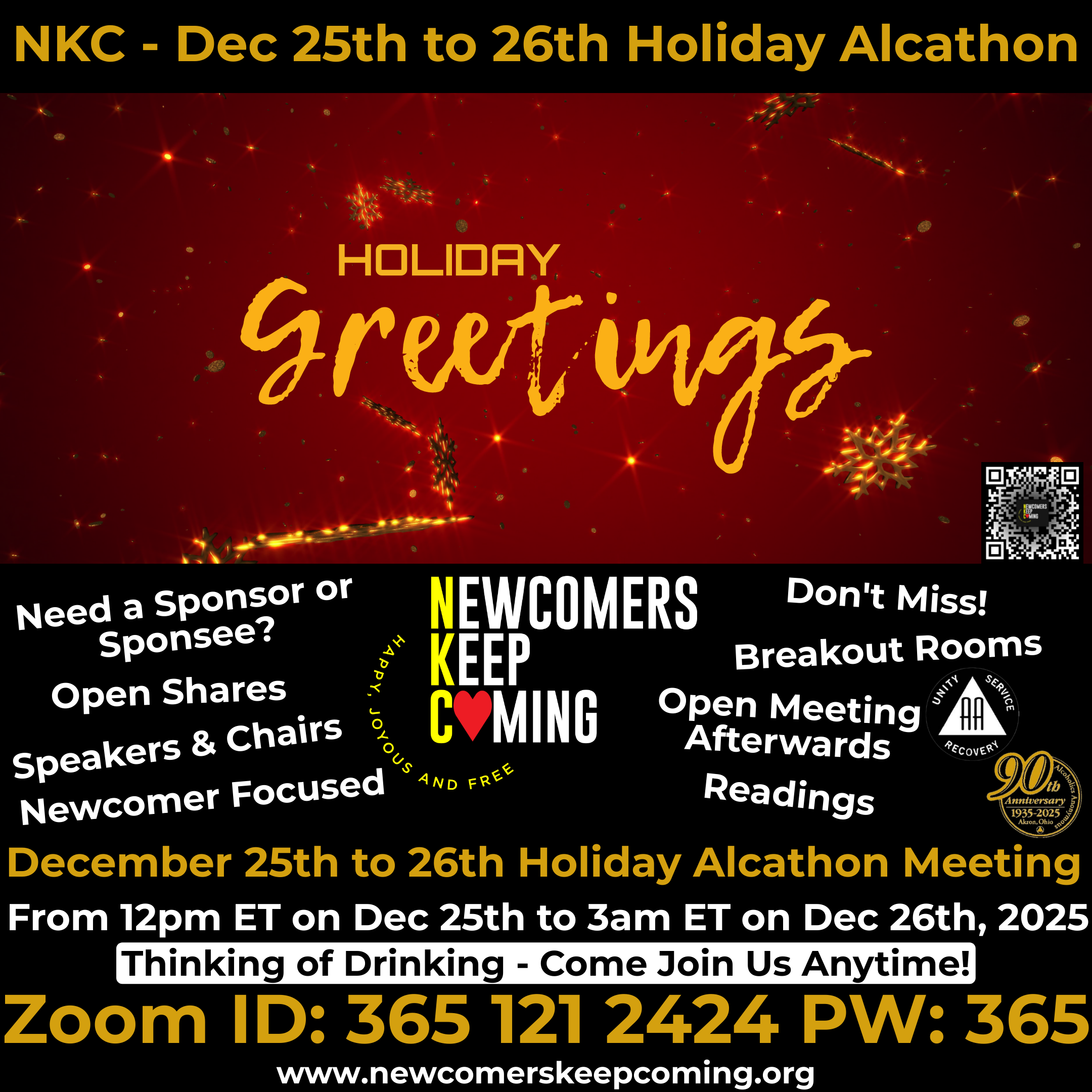Newcomers Keep Coming (NKC) -> 15 Hour <- Holiday Marathon / Alcathon Meeting -> December 25th, 2025