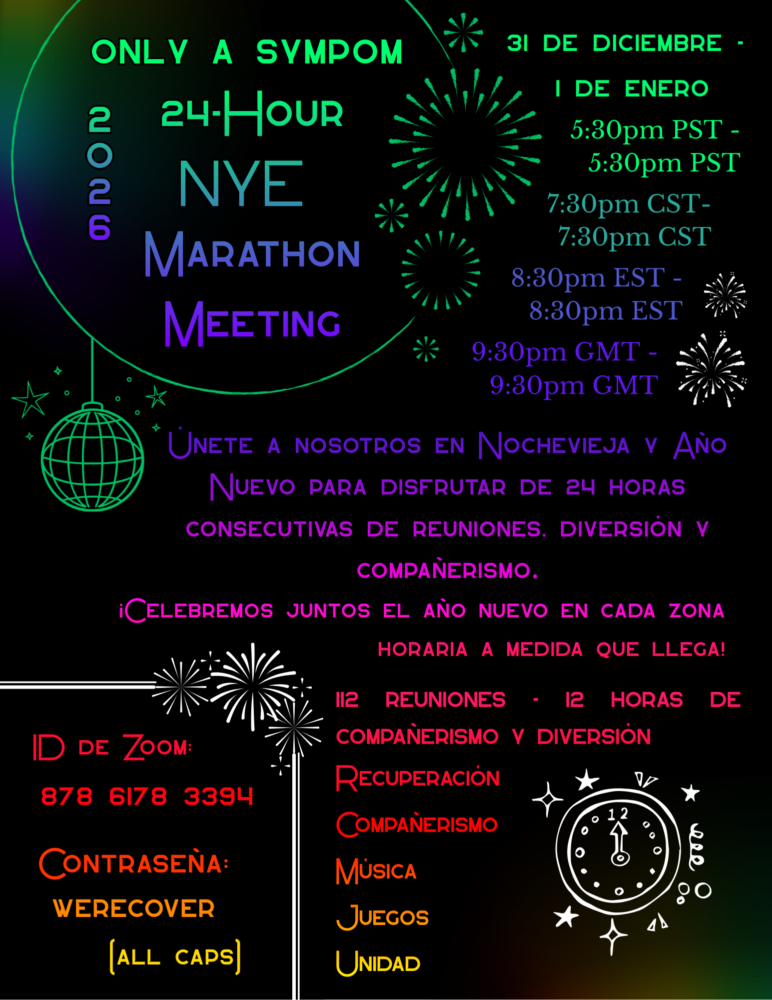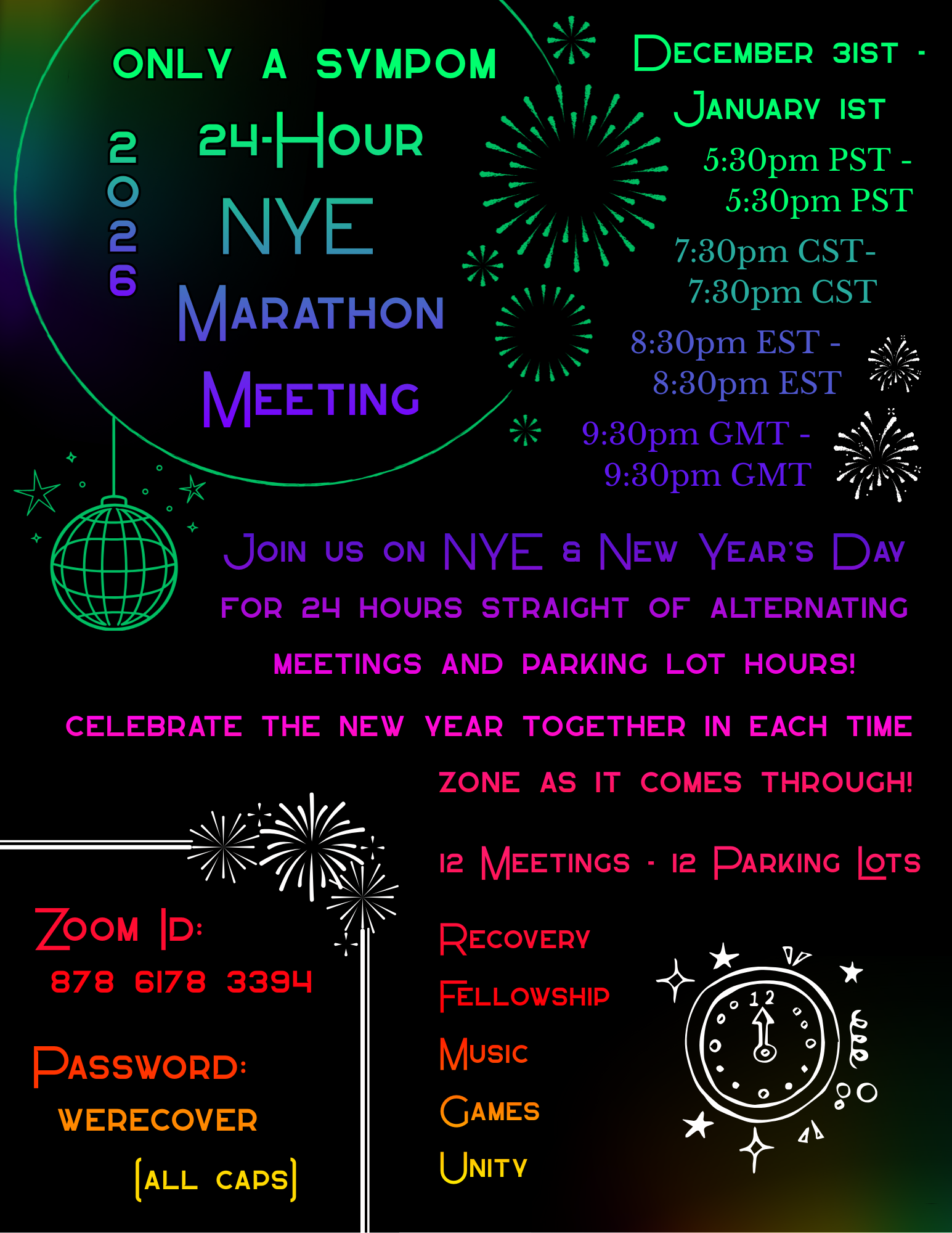 Come join us at Only A Symptom from New Year’s Eve to New Year’s Day for our annual 24-Hour NYE Marathon Meeting!