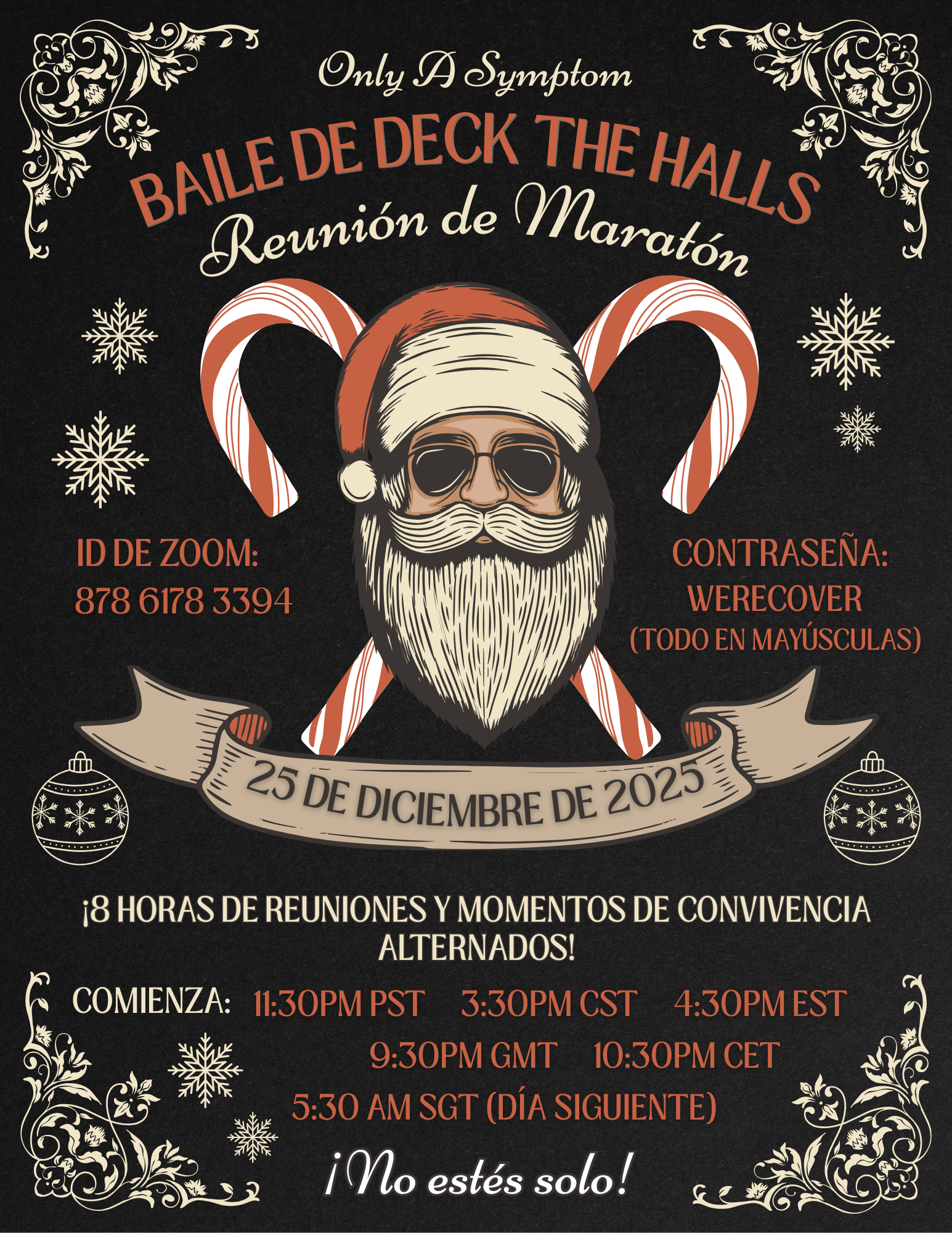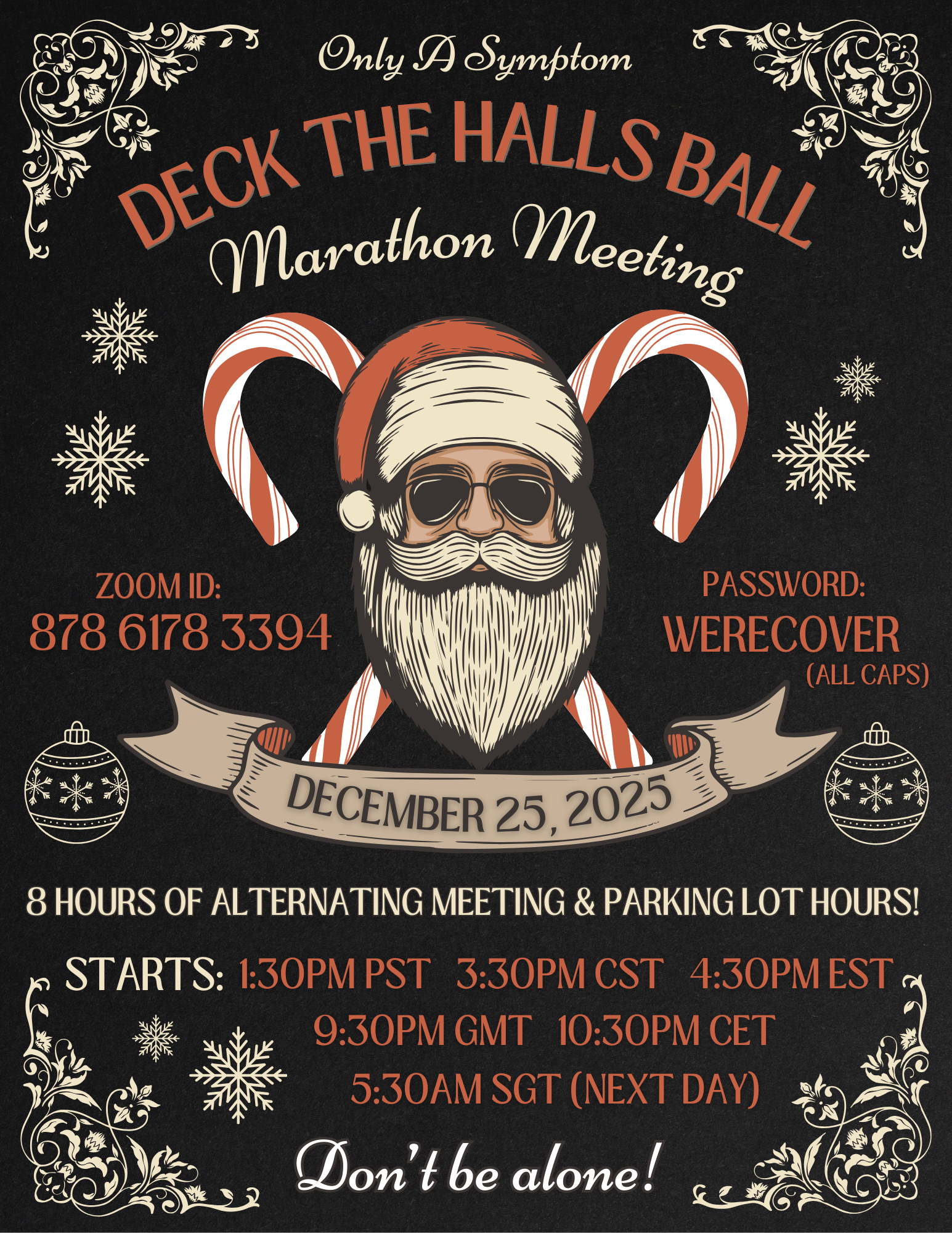 Come join us at Only A Symptom on Christmas Day – December 25th, 2026 – for our X-Mas Deck the Halls Ball Marathon Meeting!