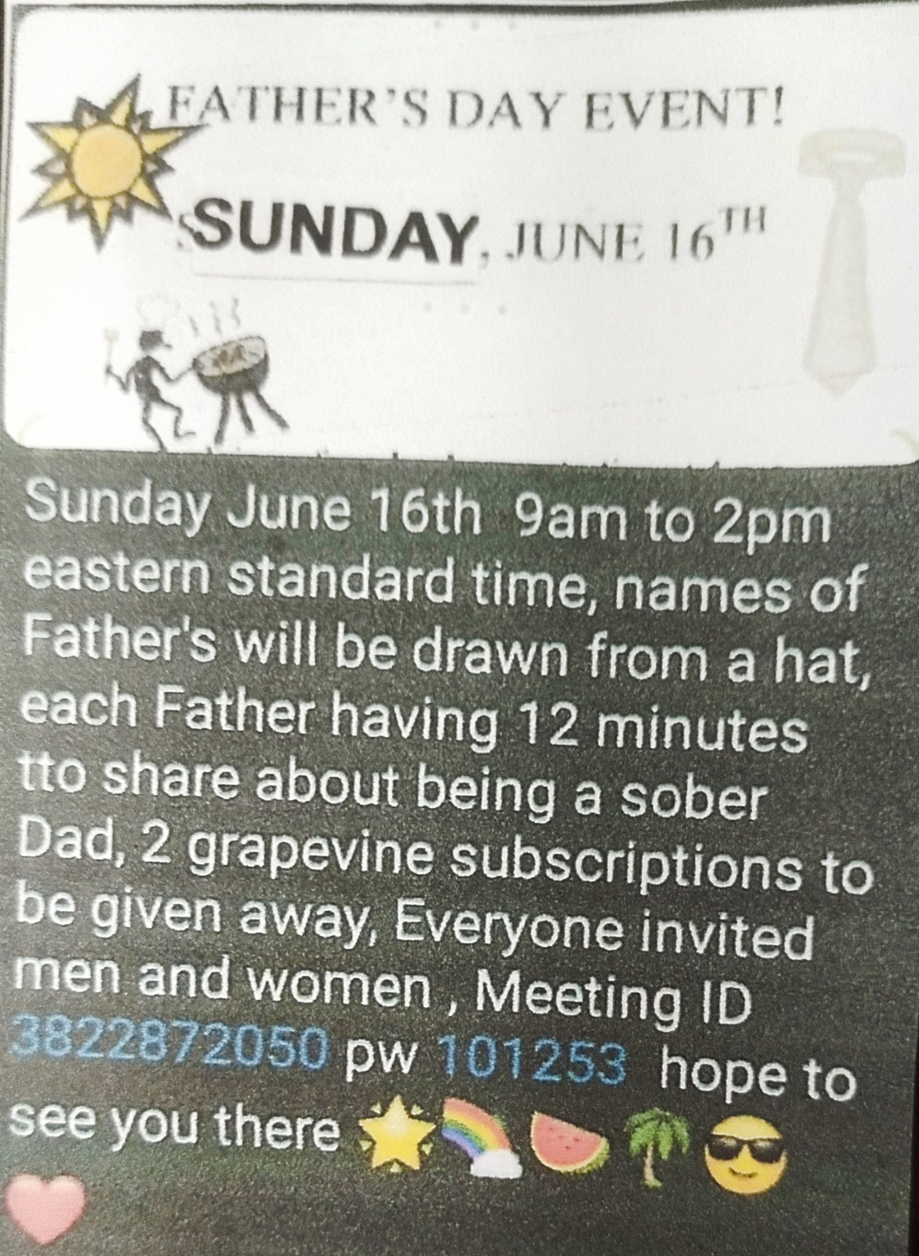 We will draw names from a hat, and each Dad will have 12 minutes to share his experience being a sober dad.