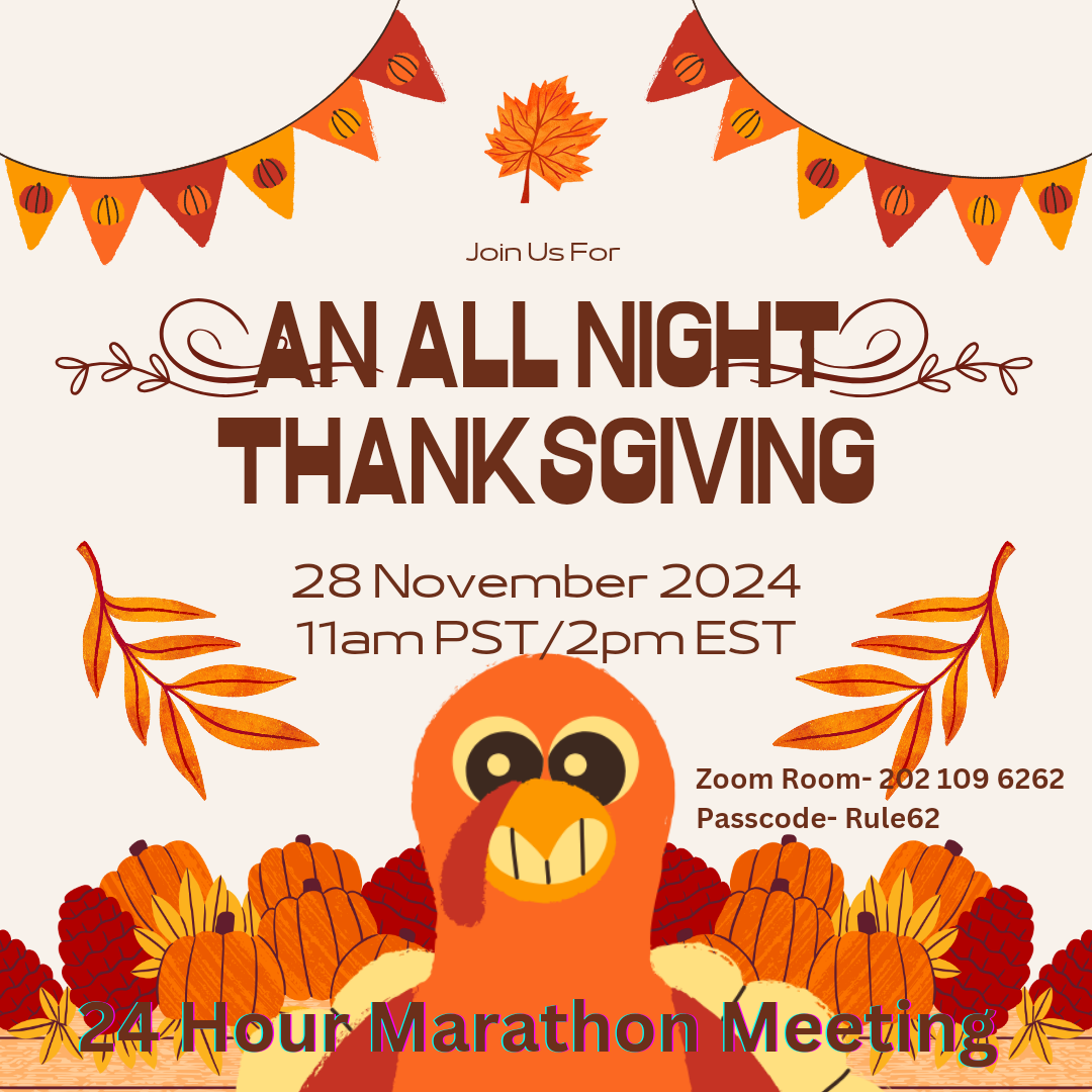 毎時間異なるホストによる24時間マラソンミーティングです。楽しさと親睦、そして一日中様々なテーマをお楽しみください。これは包括性と自由思想を持つ世俗的なグループです。