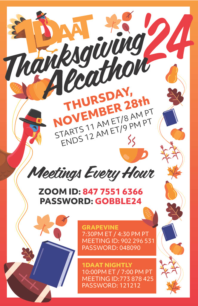 Junte-se a nós para o Alcatão de Ação de Graças do 1 Day At A Time! Começando às 11:00 ET / 8:00 PT na quinta-feira, 28 de novembro, haverá reuniões durante todo o dia, terminando com Companheirismo à meia-noite EST / 20h PT! Ainda teremos nossas reuniões programadas regularmente, nossa reunião Grape Minds Think Alike Grapevine às 19:30 EST/16:30 PT, e nossa reunião noturna de palestrantes 1 Day at a Time às 22h EST/19h PT, junto com nossas reuniões do Alcatão acontecendo a cada hora durante o dia e a noite. Você nunca precisa ficar sozinho aqui, e não somos um grupo triste, então venha se juntar a nós para diversão e muito amor!