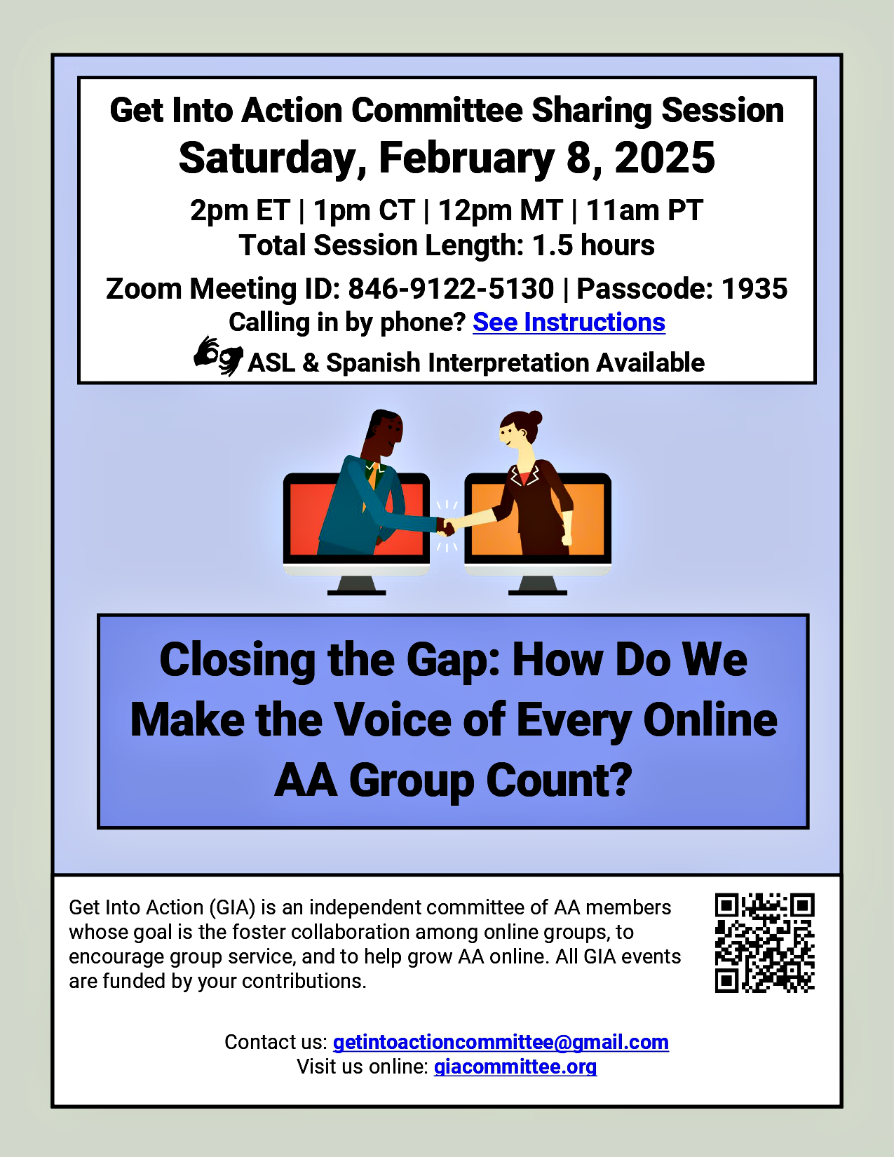 O Comitê Get into Action (GIA) realizará uma Sessão de Compartilhamento via Zoom no sábado, 8 de fevereiro de 2025, às 14h ET, 13h CT, 14h MT, 11h PT. Interpretação em ASL / Espanhol Disponível. Todos são bem-vindos.